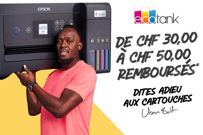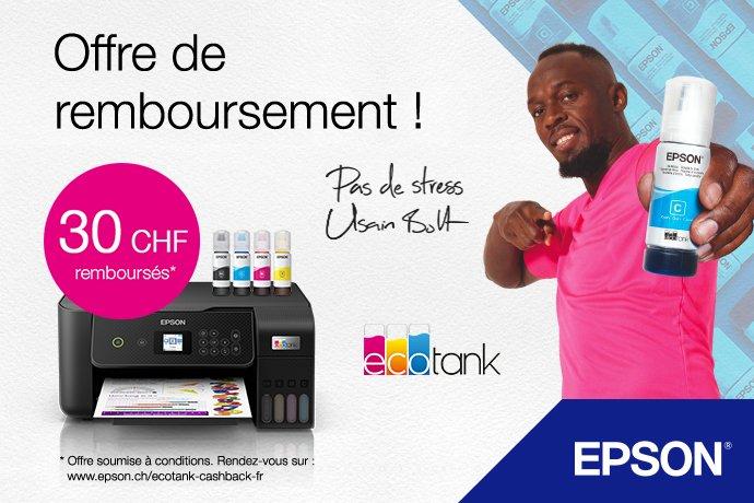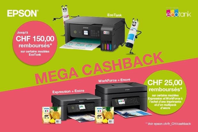 Obtenez jusqu’à 50,00 CHF de remboursement et profitez de l’impression sans cartouche pour l’achat d’une imprimante EcoTank éligible entre le 15/09/2024 et le 31/01/2025.